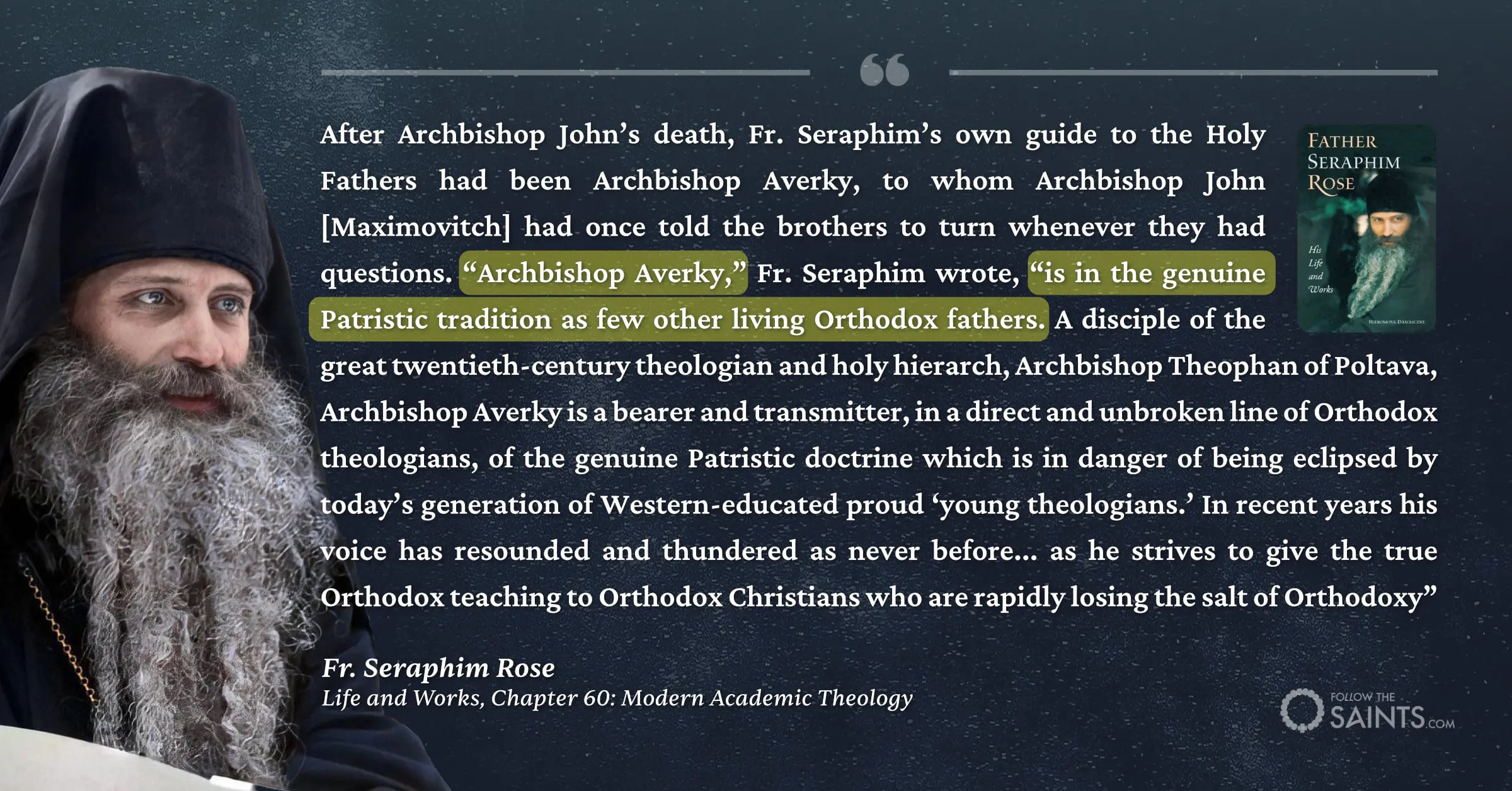 Fr. Seraphim Rose followed in the footsteps of saints like St. Ignatius Brianchaninov, St. Theophan the Recluse, St. John Maximovitch, and Archbishop Averky.