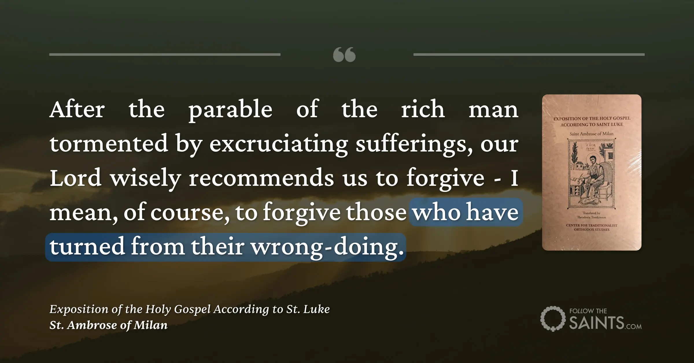 After the parable of the rich man tormented by excruciating sufferings, our Lord wisely recommends us to forgive - I mean, of course, to forgive those who have turned from their wrong-doing. This He does so that no one need feel discouraged, no one need despair of his conversion from sin. Our Lord expresses this with much kindness and moderation, balancing all that He says so that pardon does not become difficult, nor is forgiveness given too lightly. He wants no one to be put off by a harsh reprimand, nor - on the other hand - to be encouraged, by a casual sort of attitude on our part, to continue sinning.